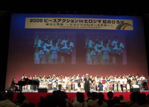 被爆者歌う会「ひまわり」による合唱のオープニングから始まり、黙祷の後、主催者として日本生協連の芳賀専務理事が「核のない社会に向けて好機が訪れている。オバマ米大統領の登場、4月6日のプラハでの『核のない世界』を目指す発言。また、核から決別する世界のウネリもある。しかし日本政府のリーダーシップは乏しい。普段のくらしから平和を考え、命を育む母親が中心の生協の役割は大きい」とあいさつされました。次に、同時刻「平和市長会議の総会」が行われているため田上長崎市長の参加が叶わなかった事が紹介されると、会場から平和市長会議成功へ向けた連帯の拍手が湧き起こりました。