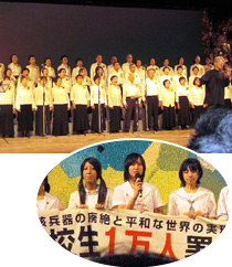 次に、「みんなのひろば」で各生協の平和活動の交流をしました。続いて、秋葉忠利広島市長が「世界は核兵器廃絶に向けて今まさに歴史的な転換点に差し掛かっています。21世紀は、市民の力で問題を解決できる時代です。今後とも私たちと一緒に行動していただくことを期待しています」とあいさつされました。次に、ヒロシマ虹のひろば合唱団による大合唱が行われました。
