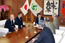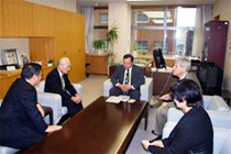 ■さいたま市と上尾市に平和市長会議への加盟要請 スティーブン・リーパー氏と平和市民5団体の代表などで、さいたま市と上尾市を訪問し、平和市長会議への加盟要請を行いました。さいたま市では清水市長様、上尾市では後藤副市長様に対応していただきました。秋葉広島市長の要請書を手渡し、要請と懇談を行いました。懇談では、核廃絶の話題以外に、埼玉の原爆死没者慰霊式や原爆症認定集団訴訟などが話題になりました。 |