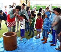イベント会場に戻ると、県産米のおにぎりを中心とした試食が準備されていました。学校給食の県産食材を使ったお味噌汁、つきたてのお餅でお腹も満たされました。次に、家庭でできるバケツ稲の栽培方法について説明がありました。説明後、テント内でヨイショ・ヨイショのかけ声に合わせて体験餅つきを楽しみました。