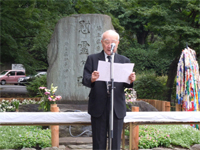主催者のしらさぎ会田中熙巳会長より「まもなく、66年目の夏がやってきます。8月を迎えると、否応なしにあの地獄のような惨状を思い起します。爆風と熱線、放射能と業火の中で無残に命を奪われた人々のこと、辛うじて生き延びながら原爆の放射線の後遺症や発病の不安に苦しめられ、亡くなっていった仲間のことを思い起します。被爆者の心の底からの強い願いにもかかわらず、地球上にはまだ2万発以上の核兵器が存在しています。原爆犠牲者への国の償いが果たされ、核兵器が地球上から一発残らず無くなったとき死者の御魂は本当に安らぐことができる。多くの支援者とともに、力を尽くします。」と慰霊の言葉がありました。
