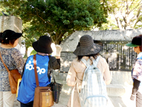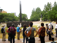 爆心地である平和公園周辺の主要な遺構・慰霊碑を見学しました。長崎市原子爆弾無縁死没者追悼祈念堂の説明からはじまり、平和記念像・モニュメント、原爆投下中心碑などで66年前の惨状を想像しながら散策しました。浦上天主堂にまつわるキリスト教徒の歴史と過酷な運命、小倉から長崎へ投下が変更されたこと、長崎中心地から浦上に投下された理由等を説明し、少しでも耳に残ったことを周りの方にお話しくださいとまとめられました。