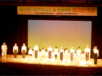 活水中学・高校のハンドベルチームによるハンドベル演奏のオープニングから始まりました。日本生協連の芳賀専務が「東日本大震災は多くのことを私たちに教えてくれました。助け合い・支え合う心が大切なこと、もっと生協を強くしないといけないことが確認できました。また、今までのくらしの有り様も問題提起されました。福島第1原子力発電所の事故から、日本のこれからのエネルギーについてまとめていきます。」と主催者挨拶、続いて、黙祷、田上富久長崎市長からの連帯の挨拶、証言と朗読劇「チンチン電車の詩」、寺井一通とメゾン・ド・シャンソンの会に皆さんによる平和コンサートなどが行われました。