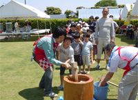イベント会場に戻ると、県産米のおにぎりを中心とした試食が準備されていました。学校給食の県産食材を使ったお味噌汁、つきたてのお餅でお腹も満たされました。次に、家庭でできるバケツ稲の栽培方法について説明がありました。説明が終わると、テント内に用意された臼を囲んで餅つき体験。一通り順番が回ると「もう1回やりたい」と2回参加する子どもたちもいて、ヨイショ・ヨイショのかけ声に合わせて体験餅つきを楽しみました。