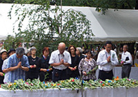 慰霊碑の横に据えられた「平和の灯」の台に、広島・長崎から移されさいたま市の常泉寺に灯し続けられている「平和の火」が点火されました。続いて、原爆死没者のご冥福と今なお原爆症に苦しんでいる方々のご多幸を祈って全員で黙祷を捧げました。