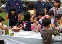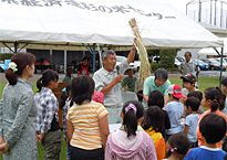 雨の上がったイベント広場にて、県産米のコシヒカリのおにぎりとキュウリの漬物、そして県産野菜がたくさん入ったトン汁、学校給食会から県内産の小麦と米を50%ずつ使ったパンが配られ試食を行ないました。お腹がいっぱいになった後に、バケツ稲の脱穀方法や籾殻取りの説明があり実際に体験しました。用意された空き缶や牛乳パックなどを使い脱穀、すり鉢と野球のボールを使って籾殻取りを行ない、子どもたちは所狭しと順番待ちをしながら楽しみました。バケツ稲の栽培体験の発表もありました。