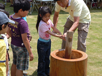 イベント会場に戻ると、県産米のおにぎりを中心とした試食が準備されていました。学校給食の県産食材を使ったお味噌汁、つきたてのお餅でお腹も満たされました。次に、家庭でできるバケツ稲の栽培方法について説明がありました。説明が終わると、テント内に用意された臼を囲んで餅つき体験。一通り順番が回ると「もう1回やりたい」と2回参加する子どもたちもおり、ヨイショ・ヨイショのかけ声に合わせて体験餅つきを楽しみました。
