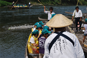 プログラムは引き続き、「ライン下り」に出発しました。荒川の渇水で心配されましたが、和船で岩畳までの船下りは、福島からの旅の疲れを癒していただくひとときとなりました。