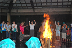 夜は、雨天ファイアー場でキャンプファイヤー。火の神様から授けられた火が点火され、勢いよく燃え上がる焚火をみんなで囲み、歌いながら楽しく過ごしました。