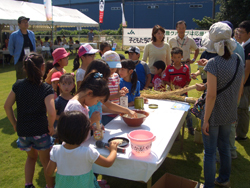イベントの第2部は、イベント広場にて、県産米のコシヒカリのおにぎりとキュウリの漬物、そして県産野菜がたくさん入ったけんちん汁、学校給食会から県内産の小麦と米を50%ずつ使ったパン等が配られ試食を行いました。お腹がいっぱいになった後は、3人の子どもたちからのバケツ稲栽培の体験発表、次にバケツ稲の脱穀方法や籾殻取りの説明がありました。用意された空き缶や牛乳パックなどを使い脱穀、すり鉢と野球のボールを使って籾殻取りを行い、子どもたちは順番待ちをしながら楽しみました。