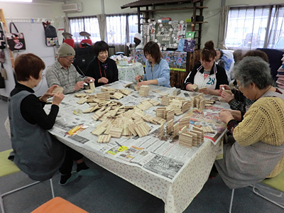 | ▲手工芸品づくりやさまざまな行事に利用されているひまわり集会所。 この日は市から依頼されたコースターを制作していました。 |