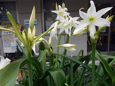 さいたま市南浦和にあるコープみらいの組合員施設「コーププラザ浦和」の玄関では、梅雨空の下で今年も被爆ハマユウの純白の花が咲きました。