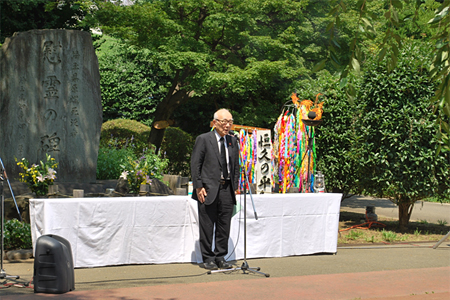 同日午前10時からの慰霊式で、埼玉県原爆被害者協議会会長の田中熙巳会長は、「再び戦争をしないことを定めた憲法9条の解釈を変えることで、日本は戦争をする国に変えられようとしています。私たちは、慰霊式を支えてくださる団体、個人としっかりと手を携えて、核兵器のない世界、核の脅威のない世界実現に向けて、力を尽くします」と慰霊の言葉を述べました。