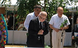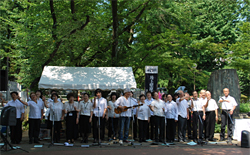 続いて、来賓の上田清司埼玉県知事の挨拶(代読)の他、各界からの参列者の紹介と挨拶の後、田中会長他が慰霊碑に献花と献水を行い、参列者が花と折鶴を献花台に供えました。若い世代からの平和の願いのアピールのあと、被爆体験聞き書き行動実行委員会による埼玉在住の被爆者の体験をまとめた朗読があり、参加者全員で「原爆を許すまじ」を斉唱し、閉会しました。