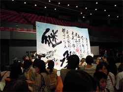 5日午後、会場となった広島県立総合体育館グリーンアリーナには全国の生協から1200人が参加しました。挨拶で松井一實広島市長は「核兵器は非人道兵器で絶対悪であり、絶対悪である核兵器の廃絶へ、平和を願う人々の思いや行動が世界中に広がっていくことを確信します」と話されました。リレーメッセージでは、被爆者を代表して広島県被団協の大越和郎さん(当時5歳で被爆)、生協組合員代表の片岡路子さん(広島中央保健生協理事)、NPO法人「IPRAY」による創作劇、大学生代表として安田女子大学書道学科の皆さんがパフォーマンスを含め、平和といのちの大切さを訴えました。また、会場内の「みんなのひろば」では、参加生協の展示や企画コーナーが設けられ、参加者が交流しました。