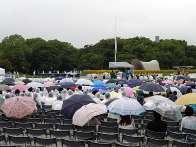 夜来の雨の中で営まれた原爆死没者慰霊式・平和祈念式(6日・平和記念公園)