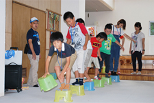 会場ではガイダンスの後、早速、グループづくりのワークショップと歓迎行事をおこないました。 ワークショップでは、4グループで「グループチャレンジ」プログラムを使って、グループづくりワークをしました。