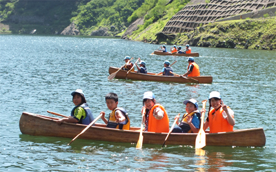 19日は、午前から名栗カヌー工房(名栗市下名栗)でのカヌー体験に向かいました。バスで名栗ダム管理施設に到着後、大型のカヌーでカヌー工房に移動し、同工房スタッフの皆さんのレクチャーを受けながら、カヌーを体験しました。