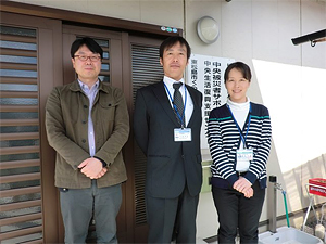 | 2015年4月から施行された「生活困窮者支援法」に合わせ、新たに5人体制で臨む東松島市くらし安心サポートセンター。生活困窮者の家計や就労などの自立相談にあたる。左から阿部誠さん、千葉貴弘所長、櫻田千里さん。 |