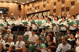 続いて、ヒロシマ市長・ナガサキ市長等のメッセージ紹介、はじめて原水爆禁止2015世界大会に参加する高校1年生からの平和の願いのアピールのあと、被爆体験聞き書き行動実行委員会による埼玉在住の被爆者7人の体験を編集した朗読があり、参加者全員で「原爆を許すまじ」を斉唱し、閉会しました。
