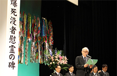 午前10時からの慰霊式は、青い空合唱団による「青い空は」の追悼合唱でオープニングし、石川稔埼玉県保険医療部部長による原爆死没者名簿奉納、平和の灯、黙祷と続きました。次に、埼玉県原爆被害者協議会会長の田中熙巳会長は、「核兵器の使用を前提とする核抑止論は人道上も許せないことで、絶対に認めるわけにはいきません。また、憲法九条を踏みにじって、国外で戦争のできる法整備を強行しようとしています。これも絶対に許すわけにはいきません。核兵器も戦争もない平和な世界に実現をめざし、ご参列のみなさまとともに力を尽くします」と慰霊の言葉を述べました。