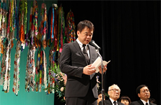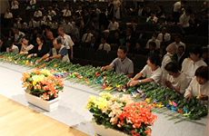 続いて、来賓の上田清司埼玉県知事の挨拶(石川稔保健医療部部長代読)、清水勇人さいたま市長、各界からの挨拶と参列者の紹介後、田中会長とご遺族、参列者が花と折り鶴を献花台に備えました。