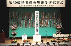 広島、長崎の原爆被爆から70年目の夏を迎えた7月26日(日)10時より、埼玉会館小ホールにて埼玉県原爆被害者協議会主催・実行委員会協力による第30回埼玉県原爆死没者慰霊式(後援 埼玉県、さいたま市、さいたま市教育委員会)が開かれ、被爆者やご遺族、県内議会議長、各党議員、実行委員会団体等から約450人が参列しました。また、13時から「被爆70周年記念さいたまの集い」が開催され、核兵器廃絶のためのシンポジム「核兵器とは共存できない」、「平和祈念作品アニメ映画 NAGASAKI 1945 アンゼラスの鐘」の上映に約400人が参加しました。