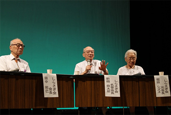 午後13時より、女優の斉藤とも子さんの司会で、肥田舜太郎名誉会長、堀田シズヱ元会長、田中会長による「核兵器と共存できない」をテーマに、原爆のとき、埼玉のしらさぎ会のこと、核兵器のない世界を未来へに向けたメッセージが語られました。