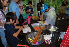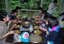 午後は、ボーイスカウト埼玉県連盟の皆さんの指導のもと、野外炊事場にて昼食づくり体験として、「カレーづくり」に挑戦しました。子どもたちは、包丁を使い、ニンジン、ジャガイモ、タマネギ等の野菜をカットしました。続いて、肉と野菜を炒め、ルーを入れて、カレーが完成。ご飯は、飯ごうを使いおいしく炊き上がりました。余るかなと思う程の量でしたが、子どもたちやボランティアはお代わりをし、きれいに食べ切りました。