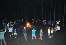 夜のキャンプファイヤーは雨の中で始めましたが、火の神や子どもたちの思いが通じ雨も上がりました。火の神様からの火が点火され、勢いよく燃え上がる焚火をみんなで囲み、ボーイスカウト埼玉県連盟の皆さんの指導で約1時間、ジェンカ、ジンギスカン等の音楽に合わせて踊り、楽しく素晴らしいキャンプファイヤーになりました。