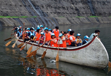お別れの会(退所式)、集合写真撮影後、名栗カヌー工房(名栗市下名栗)に向かいました。カヌー工房に到着後、同工房スタッフの皆さんのレクチャーを受けながら、100人乗りと4人乗りのカヌーを体験しました。体験後、そうめん、おにぎり、から揚げ、コロッケ等の昼食をとりました。楽しかった三日間を終え、名残り惜しそうにボランティアの皆さんとお別れをし、郡山に向かいました。