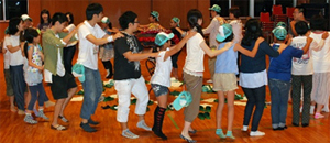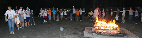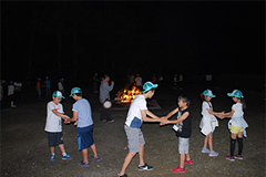 夕食後には、翌日におこなうキャンプファイヤーにむけて、歌やおどりの練習を行い、1日目のプログラムを終了しました。