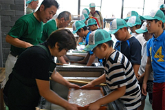 最終日は、小川げんきプラザで退所式をおこなった後、小川町にある埼玉伝統工芸館に移動し、ユネスコ無形文化財の細川和紙の和紙すき体験をおこないました。同施設にて昼食をとり、郡山駅に向けて出発しました。
