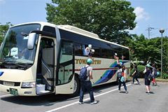 郡山駅に集合した子ども達は、迎えにいった学生ボランティア・生協スタッフとともに、バスで埼玉県にむけて出発しました。移動は順調で、予定より1時間早く小川げんきプラザに到着。昼食後は施設周辺を散策しました。14時からは、活動施設に移動し、小川げんきプラザへの入所式、ボーイスカウト連盟の皆さんによるグループづくりプログラムを行いました。