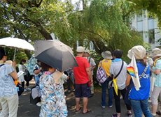 生協ひろしまの碑めぐりガイド恵美さんの案内で、護国神社鳥居脚部、被爆柳、本川町慰霊碑、空鞘神社、本川小学校平和資料館など市内中心部の遺構・慰霊碑など71年前の出来事を想像しながら見学しました。