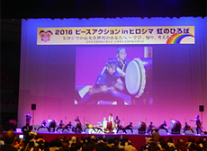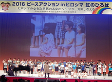 「虹のステージ」は、私立広島文教女子大学付属高校和太鼓部「文教太鼓 葵」の演奏で始まり、松井一實広島市長あいさつ、主催者あいさつ(和田寿昭専務理事)、日本被団協60周年の取り組み報告(岩佐幹三さん)、若者からのリレーメッセージと続きました。「みんなのひろば」は、生協・諸団体の展示、2020ビジョンコーナー、折り鶴解体体験コーナー等があり、約1時間の見学や交流の場となりました。フィナーレは、子ども平和会議の取り組みとアピールの紹介、虹のひろば合唱団による「大地讃頌」等の平和のうたが披露されました。