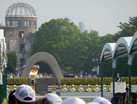 式典は市長と遺族代表による「原爆死没者名簿奉納」から始まりました。松井広島市長は「平和宣言」で「今こそ、非人道性の極みである『絶対悪』をこの世から消すさる道筋をつけるためにヒロシマの思いを基に、『情熱』をもって『連帯』し、行動を起こすべきではないでしょうか。」と呼びかけました。