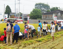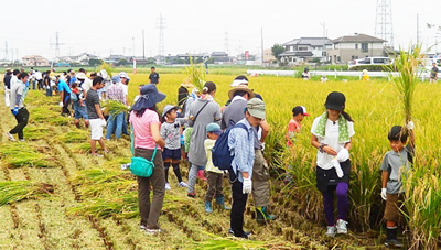 9月17日(土)、 稲刈り日和の中、JA全農さいたま・埼玉県生協連共催、杉戸町・埼玉みずほ農協後援の「体験稲刈り&田んぼの生きもの調査」が、杉戸町高野農村センター及び隣接の田圃にて、生協組合員等29家族93人(大人45人・子ども48人)の参加で開催されました。