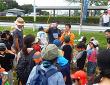 稲刈りの2グループに別れた後、指導員より生きもの観察のコツ、虫を取るコツ、ポケット版の図鑑の説明を受けた後、子どもたちは、虫かごやアミを持って田んぼに入り、カエル・コオロギ・バッタ等を捕ました。その後、捕まえた生きものの発表会で正式な名前を指導員に教えてもらいました。