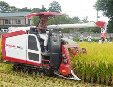 はじめに、危険のないよう鎌の使い方の説明をうけ、家族毎に分かれて稲刈りを開始、親子で楽しく稲刈りを体験、次にコンバインによる収穫実演を見学しました。