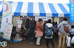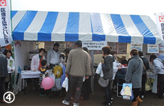 生協からは、生協の取り組みの紹介と合わせ、コープみらいは、ココアの販売・写真展示・ポケットティッシュのつかみ取り・パンチ風船等(写真①)、パルシステム埼玉は、ヨーグルト・プリンの試食等(写真②)、生活クラブは、みかんジュースと牛乳の試飲・骨密度測定・クイズ等(写真③)、医療生協さいたまは味噌汁塩分チェック・血圧測定等、握力テスト等(写真④)、埼玉県生協連はさいたまの生協の紹介と消費者被害防止クイズを行いました。