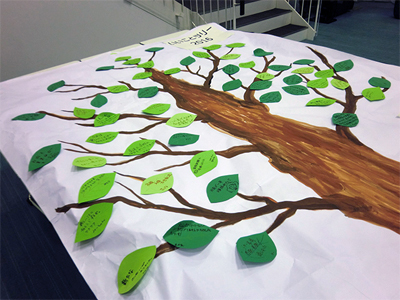 子どもたちの作った「2016年のいいことツリー」。“新しい家に引っ越した”“高校に入学した”など嬉しい出来事を書いたカードが並ぶ。
