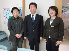 | 「自治会の副会長さんや班長さんをはじめ住民の方が助けてくれるのでありがたい」と話す藤原武寛さん | 「地域の住民が主体となって動けるようサポートしていきたい」と気仙沼市社会福祉協議会ボランティアセンターの阿部陽子さん(右)、畠山隆弘所長、齋藤貴恵さん。 |