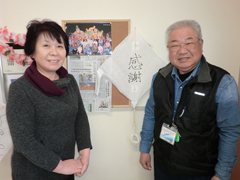 | 東松島市あおい地区。 JR東矢本駅の北側に広がる市内最大の防災集団移転地です。 | あおい地区会会長の小野竹一さんと 事務局員の木村恵子さん。 |