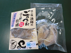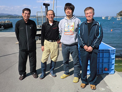 | 日本で初めて養殖版海のエコラベルと言われるASC国際認証を受けた戸倉のカキを、酒粕で加工した「ほろ酔い牡蠣」。 | 水戸辺漁港で戸倉漁師の会の皆さん。 左から松岡孝一さん、村岡賢一さん、小野寺喜義さん、佐々木和志さん。 |