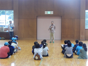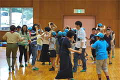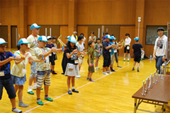 福島駅及び郡山駅に集合した子ども達は、迎えにいった学生ボランティア・生協スタッフとともに、バスで埼玉県にむけて出発、渋滞もなく順調に小川げんきプラザに到着しました。その後、グループごとに昼食をとりました。13時30分から、活動施設に移動し、小川げんきプラザの入所式、埼玉県生協連と会員生協(コープみらい・パルシステム埼玉・生活クラブ生協埼玉・医療生協さいたま)、埼玉県ボーイスカウト連盟からの歓迎挨拶、14時から、ボーイスカウト連盟の皆さんが、進化ジャンケン・積み木自己紹介・一筆書きゲームなどのグループづくりワークショップをおこないました。16時から、プラネタリウムにて、夏の夜空と銀河鉄道の夜を鑑賞しました。夕食後の19時から、ボーイスカウト連盟の皆さんが、ロープオブザリング(本結びをマスターしよう)・笛づくり・ぶんぶんゴマ・弓矢当てなどのレクリエーションをおこないました。