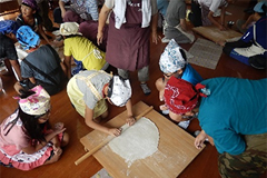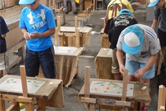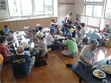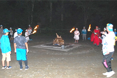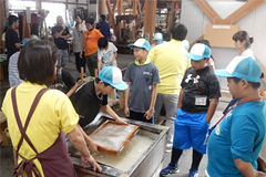 7時より、ラジオ体操を実施し、朝食をとりました。その後、東秩父村の東秩父和紙の里にバスで移動。10時10分より、7グループに分かれて「そば打ち体験」を実施し、昼食には自分たちで打ったそばと天ぷらをおいしくいただきました。13時からは「和紙すき体験」をおこないました。和紙の里で思いっきり楽しんだ後、小川げんきプラザに戻り、キャンプファイヤーに向けた準備をし、18時40分からキャンプファイヤーをおこないました。