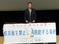 核兵器禁止条約は7月に採択、条約を作るにあたりICANが重要な役割を果たしたのでノーベル平和賞を受賞。禁止条約の内容はヒバクシャが署名で訴えてきたものです。条約の発効には50か国以上の署名と批准が必要ですが5か月経ちますが核保有国の抵抗もあり進んでいません。条約発効のためには署名を大きく進めていくことが大事。今日の集会を1つのステップにしてこれまでにないようなことも考え取り組んでいきましょう。