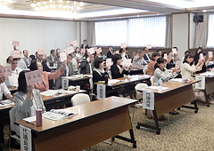 次に岩岡会長理事より、2017年度のまとめや2018年度計画など第1号から第5議案までの提案がされ、議案討議では、4人の代議員から発言がありました。発言を受け、岩岡会長理事が議案討議のまとめを行いました。