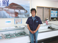 | 鳥の海ふれあい市場で橋元勇支所長。 毎週土・日には、このふれあい市場の一角に浜っこかあちゃん市のコーナーが設けられ、婦人部メンバーが作ったカレイの唐揚げなどの加工品が並びます。 |